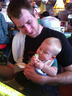 We got to hang out with Mom's friend Megan a couple times this week. On Sunday we went for a walk down by the river and got ice cream afterwards. We went out for sushi on Tuesday. This will probably be the last time Timothy gets to go out to eat for a while. Did you know he is a ninja? Anything within his reach will be destroyed, including sushi rolls, glasses full of water and paper napkins...
